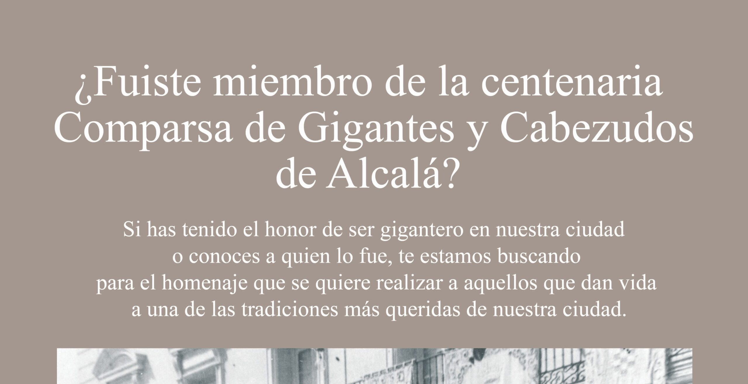 Se ha puesto en marcha la iniciativa ‘¿Fuiste miembro de la centenaria Comparsa de Gigantes y Cabezudos de Alcalá?’ con el objetivo de localizar a todas aquellas personas que, a lo largo de los años, han formado parte de la Comparsa de Gigantes y Cabezudos, una de las tradiciones más queridas y arraigadas de la ciudad.