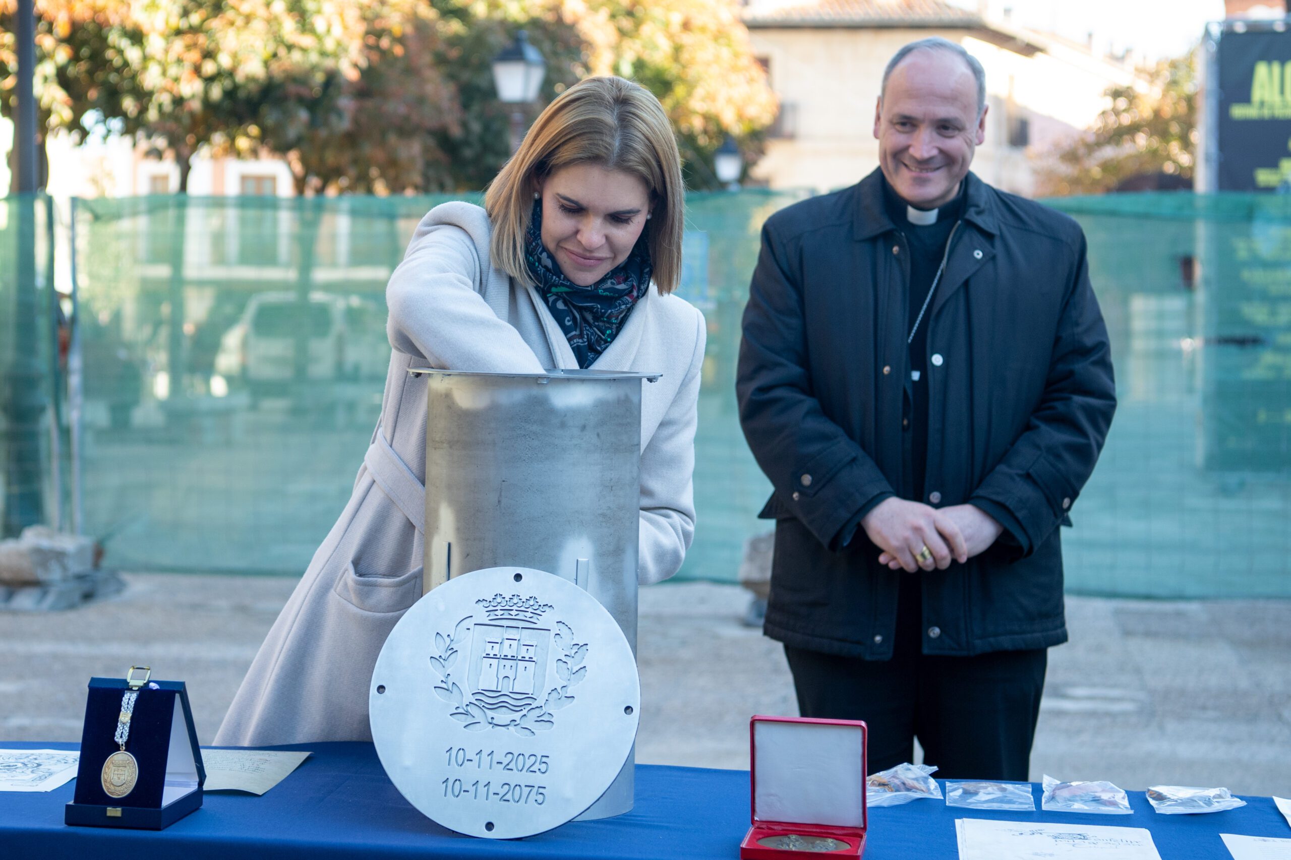 La alcaldesa de Alcalá de Henares, Judith Piquet, y el obispo de la diócesis complutense, Antonio Prieto Lucena, han participado esta mañana en la colocación en la Plaza de los Santos Niños de una cápsula del tiempo, que permanecerá enterrada en la zona poniente de este espacio emblemático de la ciudad. El acto también ha contado con la presencia del concejal de Patrimonio Histórico, Vicente Pérez, y los tenientes de alcalde Isabel Ruiz Maldonado, Víctor Acosta, Cristina Alcañiz y Gustavo Severien, entre otras autoridades.